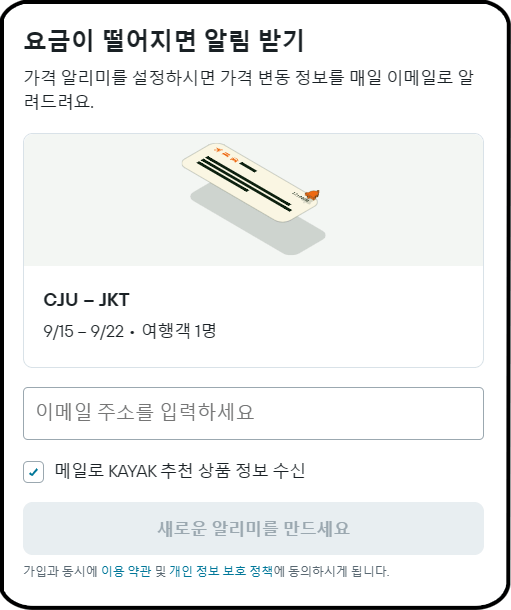 '가격 추적' 기능을 체크해 놓으면 검색한 항공권 가격을 모니터링해서 항공권 가격이 저렴해졌을 때 알림을 보내줘요. 여행 일정과 관련된 다양한 꿀팁과 정보도 함께 메일로 제공받을 수 있으니 이점 활용하셔서 저렴하고 알찬 나만의 여행 계획을 세워보세요😊